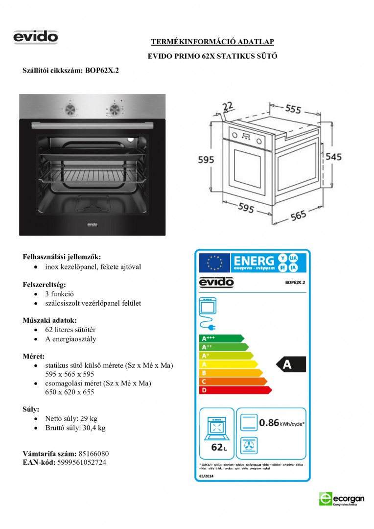 EV.PRIMO 62X statikus Sütő