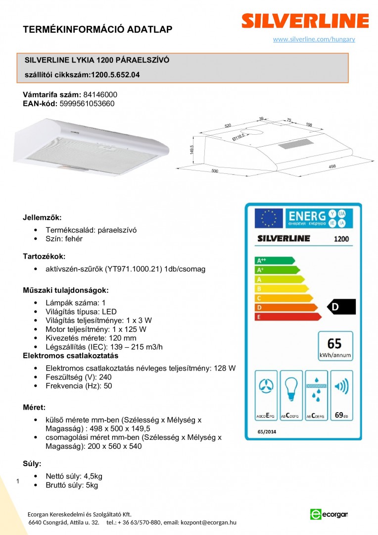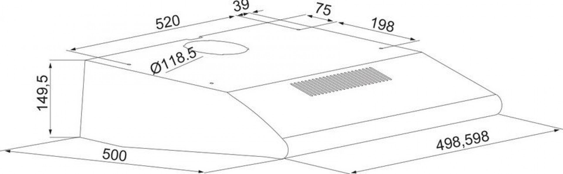 Szabadonál vagy szekrény alű szerelhető páraelszívó, egy fém zsírszűrő, 1*28W halogén világítás, légszállítás (IEC): 143-195 m3/h zajszint: 51-61 dB, csatlakozócsonk: 120 mm E energiaosztály